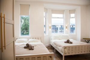 Accommodation consists of four bedrooms with seven beds across the unit, two bathrooms featuring both a bath and shower, as well as two living rooms with seating areas that include flat-screen TVs offering streaming services. Additional room amenities include parquet floors, free toiletries including soap, an iron, washing machine, smoke detectors for safety, non-feather pillows on the beds, a rack for hanging clothes, carpeted flooring in some areas, and facilities suitable for families such as cribs.