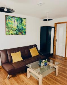 The apartment comprises two separate bedrooms, a living room with heating, and one bathroom fitted with a bathtub and stocked with free toiletries. Guests have access to a fully equipped kitchen featuring an oven, microwave, stovetop and refrigerator alongside a washing machine for added convenience. A flat-screen TV with streaming services complements the seating area which overlooks the garden.